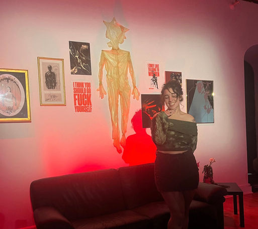 RED LIGHT DISTRICT was a Godine Family Gallery installation simulating a European night lounge after hours.The vacancy of the club felt like it was 4am constantly, not an ounce of sunlight, music continuously playing muffled like you’re in the bathroom of a party. The audience is invited to walk around, observe the curated gallery wall, consisting of pieces to do with gender and sexuality.In the space, two back alcoves serve as a dual confessional, one religious with many candles and shrine of religious figures, you are encouraged to either feel uncomfortable by the looming presence or comforted by the father figure to pray.The other alcove something more physical, throughout the week artist Onyx Raia, comes in full black latex, faceless and invites you to one on one talk about your inner thoughts pulling it out of you with deep questions as they slowly massage your hands with lotion. The idea seeming uncomfortable, but when in an enclosed space with faceless figure, you begin to open up.